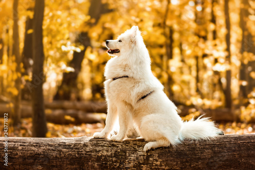 Dog Breed Samoyed Husky White Long Haired Dog In The Autumn Forest