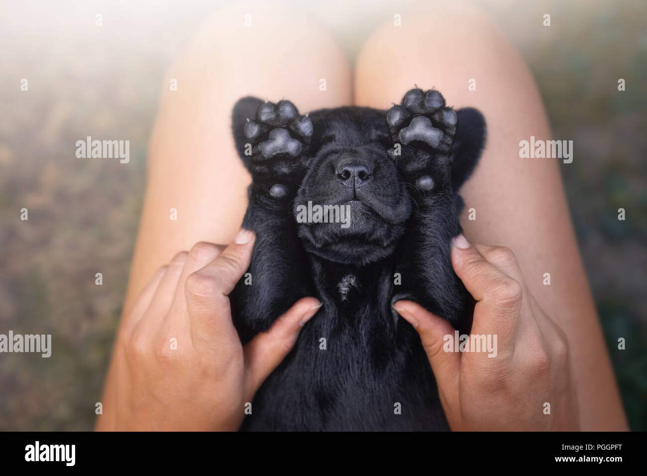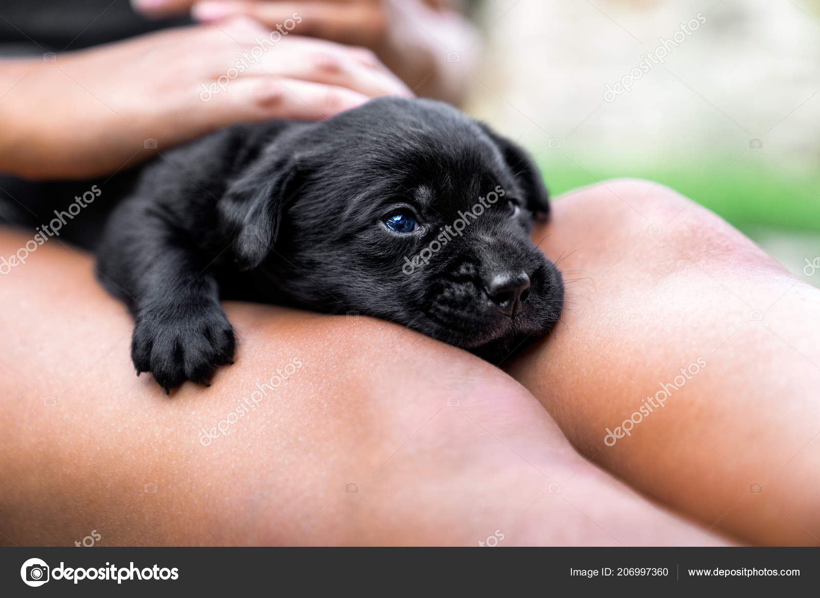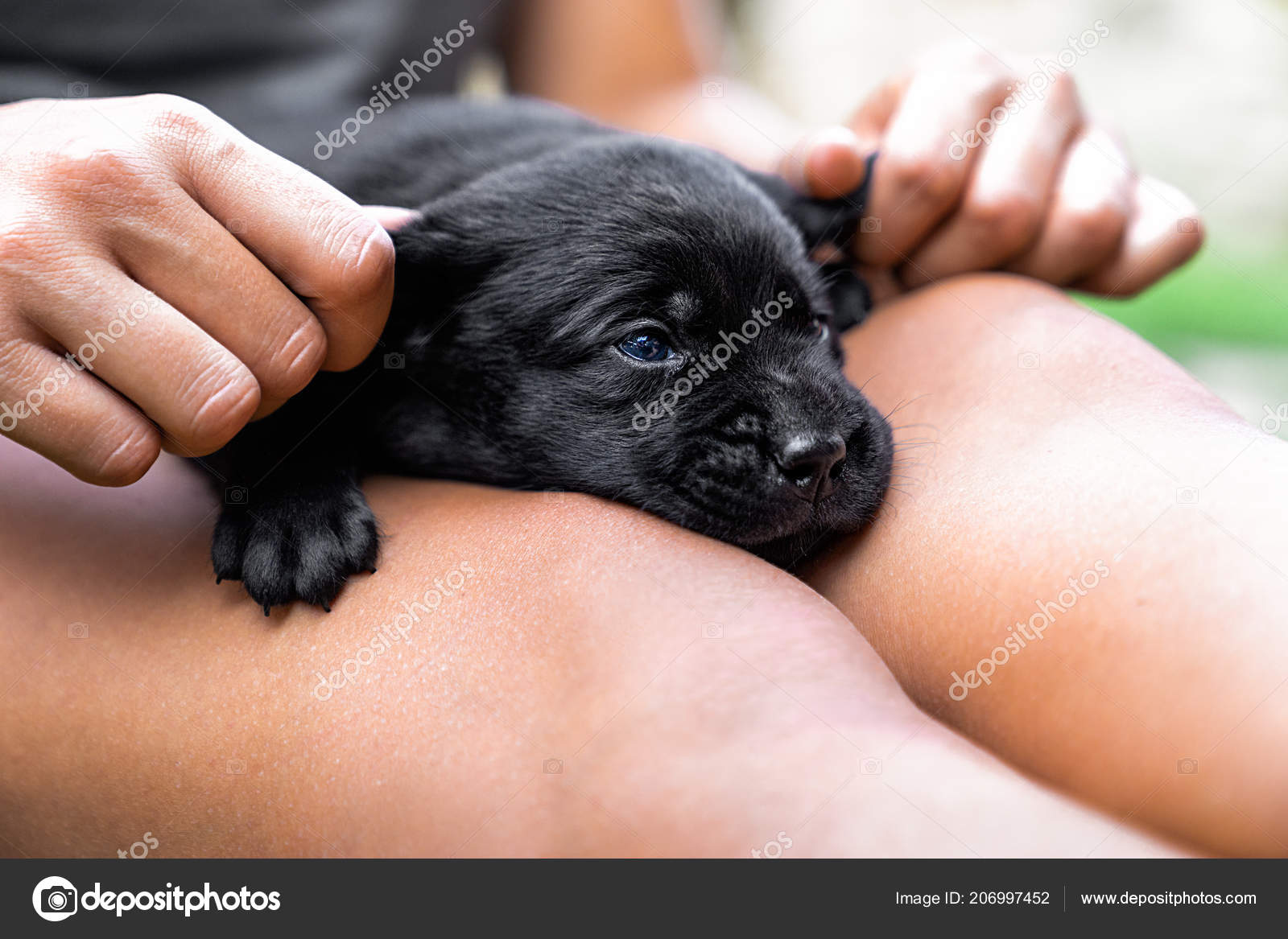 Young Cute Black Labrador Retriever Dog Puppy Lying Knees Tanned