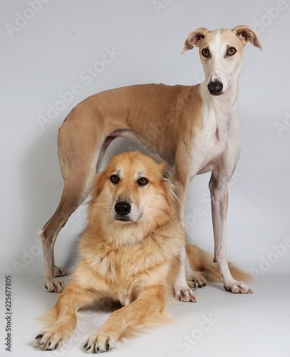 Beautiful Brown Galgo Is Standing Over A Lying Mixed Shepherd Dog In