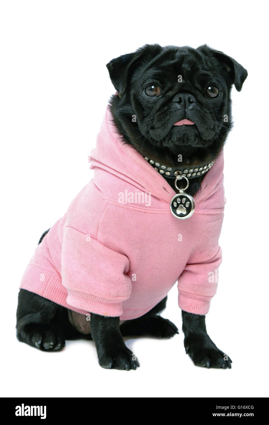 Small Black Pug Puppy Dog In Pink Clothes Isolated On White Stock
