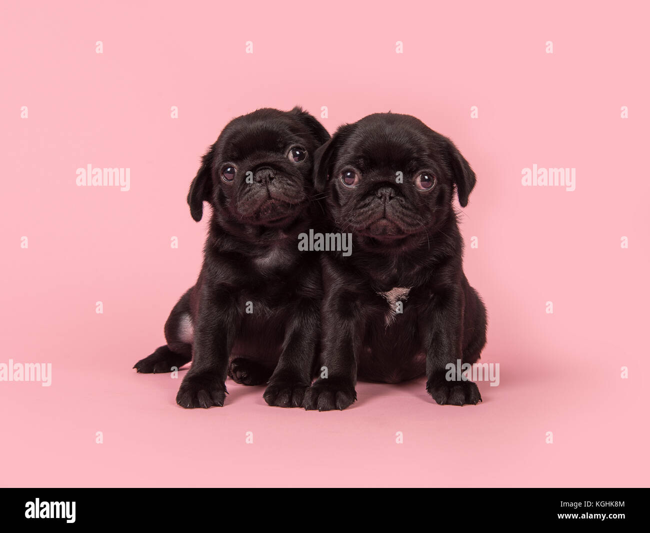 Two Cute Black Pug Puppies Looking At The Camera Sitting On A Pink