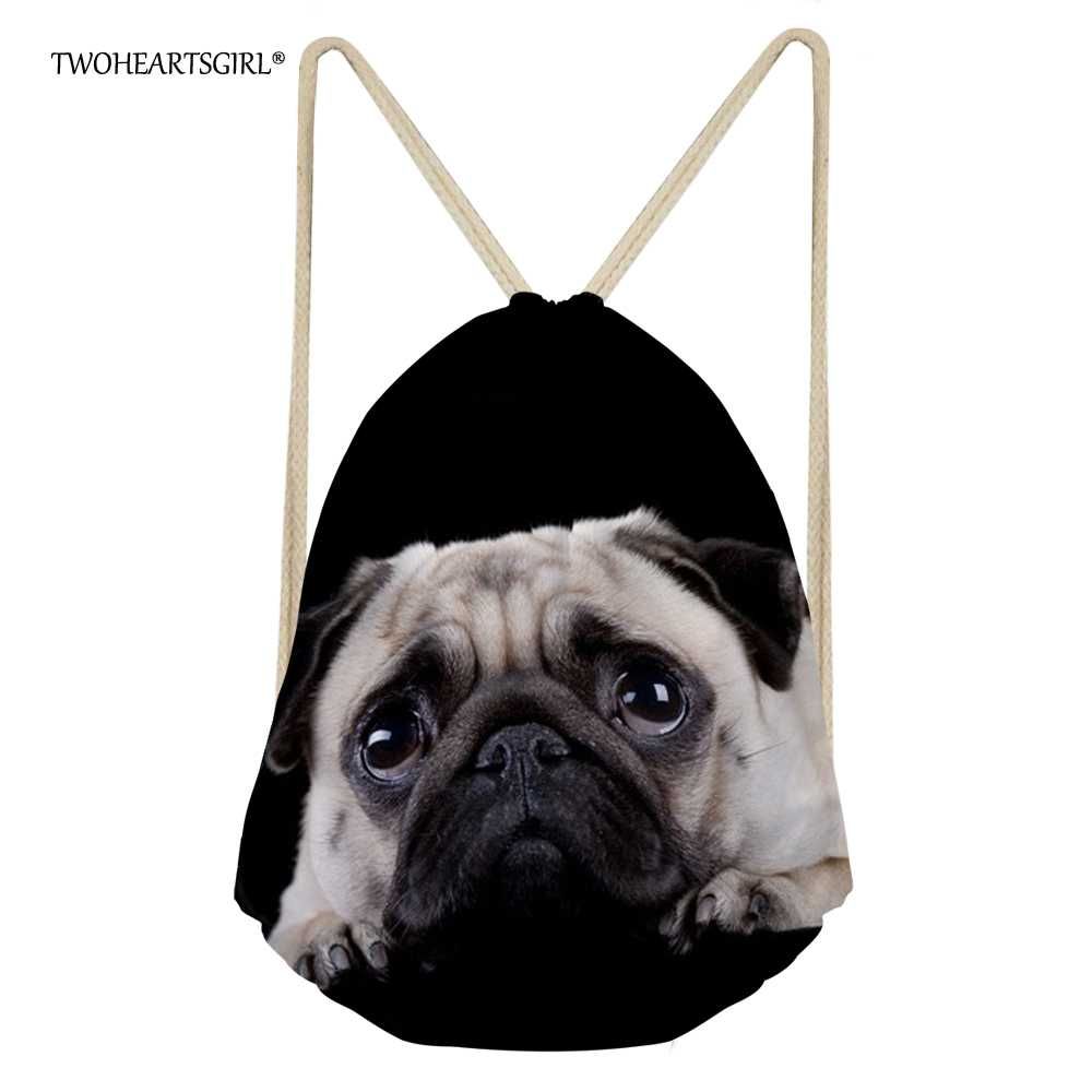 2019 Twoheartsgirl Black Schoolbag Cute Puppy Pug Dog Drawstring Bag