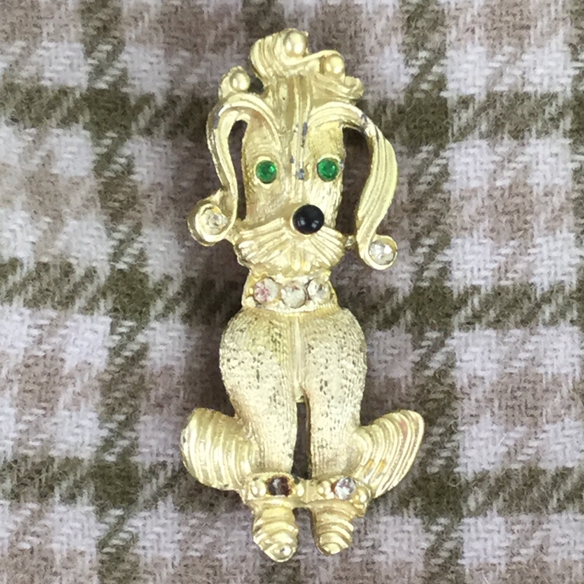 Vintage Golden Poodle Dog Brooch With Green Rhinestone Eyes Etsy