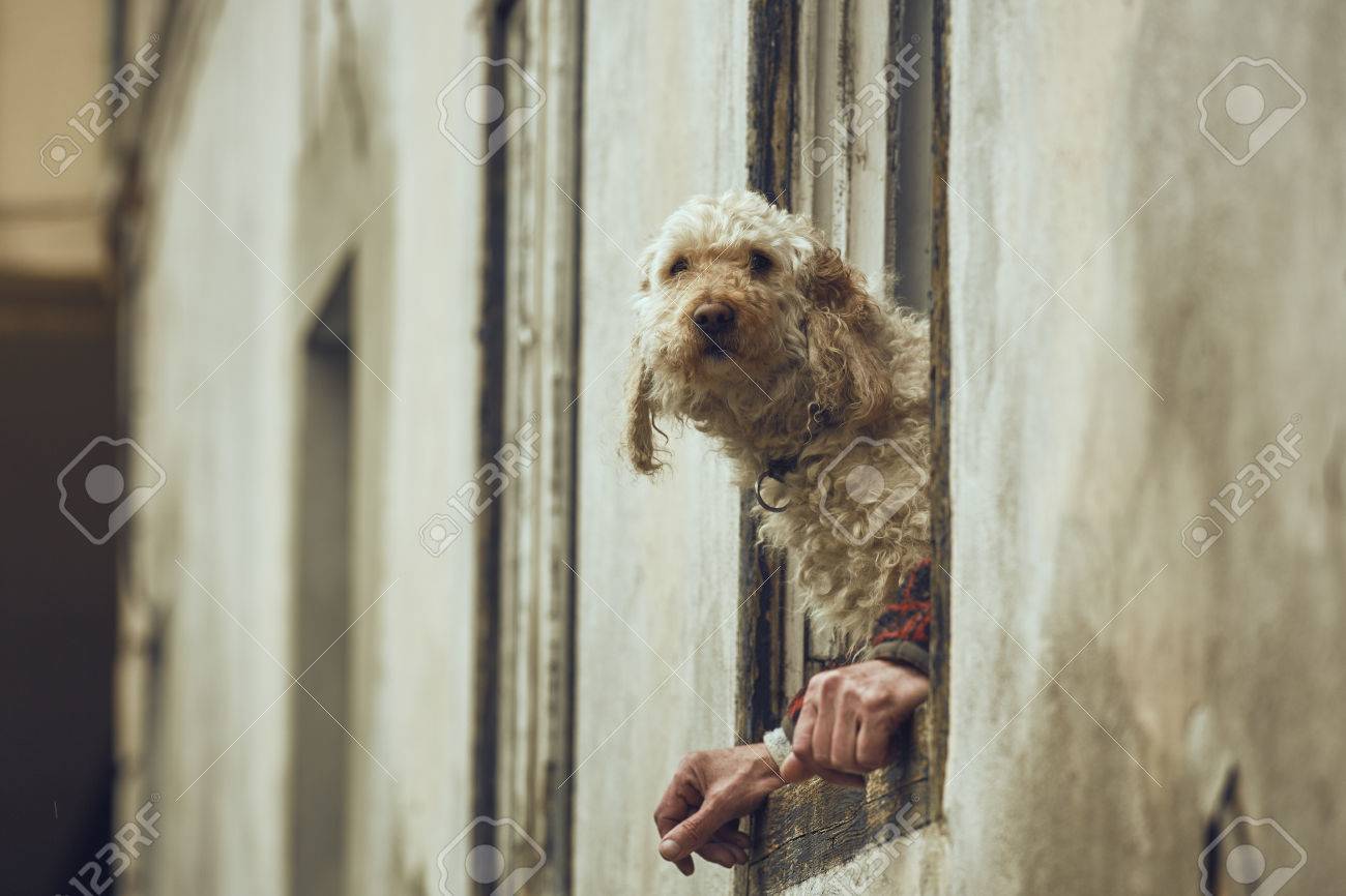 Curious Fluffy Golden Poodle Dog Sitting On A Window Sill Between
