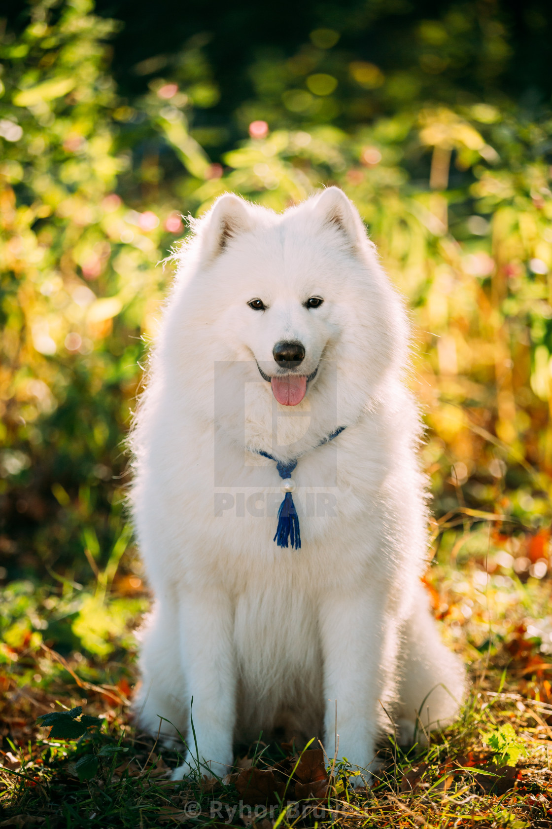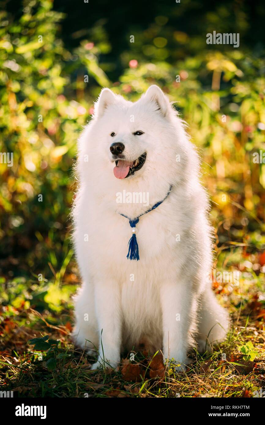 White Samoyed Dog Sit Outdoor In Bushes Park Only Dog License