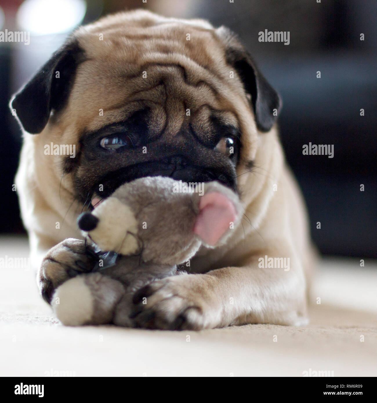 Funny Pug Dog Playing With A Plush Toy Mouse Stock Photo 236176352